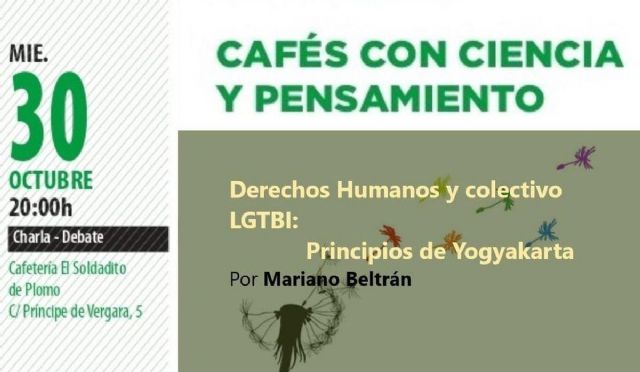 'Derechos humanos y colectivo LGTBI: Principios de Yogyakarta' es el tema que Cartagena Piensa propone este miércoles 30 de octubre, en una nueva cita de los Cafés Conciencia y Pensamiento, que tendrá lugar en la cafetería El Soldadito de Plomo, a las 20:00 horas. En esta ocasión, el invitado es Mariano Beltrán, psicólogo, activista y observador de Derechos Humanos, gracias a la colaboración del Colectivo Galactyco de Cartagena.