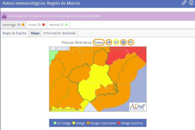 También afectando al municipio de Cartagena se mantiene activo el aviso nivel naranja por fenómenos costeros (viento fuerza 8 y olas de 4 m) en todo el litoral de la Región desde las 17 horas de hoy hasta las 10 de la mañana de mañana lunes y aviso naranja por viento en Cartagena y Mazarón con rachas de hasta 90 km/h, desde las 15 horas de hoy hasta las 10 de la mañana de mañana.