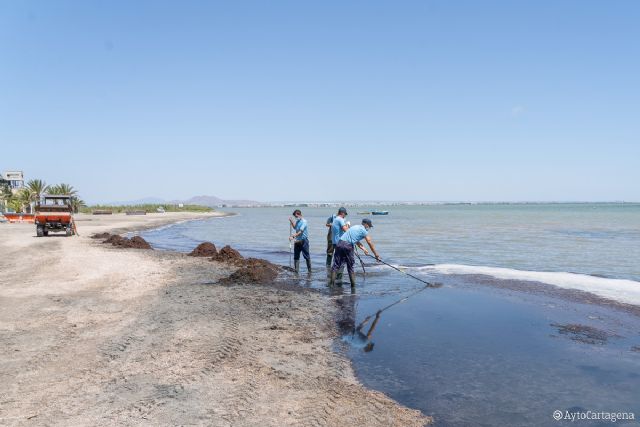 Las brigadas, que continuarán trabajando mientras dure la temporada de baño, han retirado en agosto 60 toneladas de algas y biomasa. Esta cantidad se suma a las labores de refuerzo que se realizaron en los meses anteriores con 16 operarios contratados en procedimiento de emergencia por el Ayuntamiento de Cartagena y los 30 que contrató la Comunidad Autónoma.