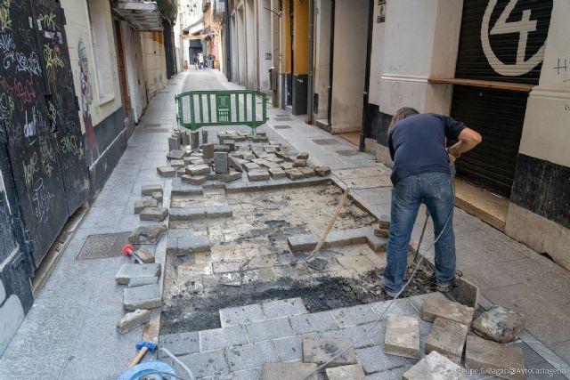 Personal de las brigadas municipales del Ayuntamiento de Cartagena está acometiendo durante estos días la reparación del pavimento de las calles Cuatro Santos, Adarve y Plaza de San Francisco.