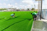 En la ciudad deportiva Gómez Meseguer, continúan los trabajos de renovación y ya esta semana se ha comenzado a instalar las planchas del nuevo césped artificial, que ocupará una superficie de más de 6.600 metros cuadrados.