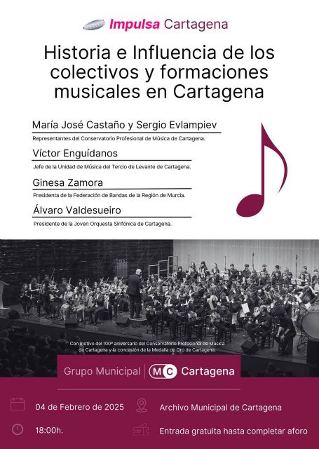 Se trata de una sesión en la que se abordará la historia e influencia de los colectivos y formaciones musicales en Cartagena, y en la que participarán María José Castaño y Sergio Evlampiev, directora y profesor del Conservatorio Profesional de Música de Cartagena, respectivamente; Víctor Enguídanos, jefe de la Unidad de Música del Tercio de Levante de Cartagena; Ginesa Zamora, presidenta de la Federación de Bandas de la Región de Murcia; y Álvaro Valdesueiro, presidente de la Joven Orquesta Sinfónica de Cartagena. El encuentro tendrá lugar el próximo martes 4 de febrero, a las 18.00 horas en el Archivo Municipal de Cartagena, con entrada libre hasta completar aforo.