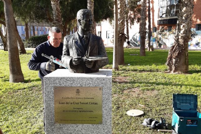 El Ayuntamiento de Cartagena restaura e instala de nuevo el busto de bronce del artista Juan de la Cruz Teruel. Esta escultura fue recuperada por la Policía Local el pasado 7 de enero tras ser sustraída de su emplazamiento junto al Centro Cultural Ramón Alonso Luzzy y la avenida Ronda Ciudad de La Unión.