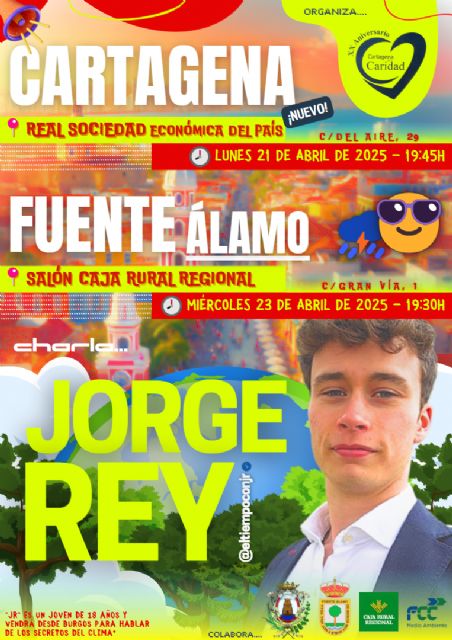 La asociación benéfica Cartagena por la Caridad va a traer a Cartagena y Fuente Álamo a Jorge Rey, el joven que, con tan solo 18 años, ha revolucionado el panorama de la predicción del clima basándose en las cabañuelas, el método tradicional que combina observación natural y conocimiento estacional.