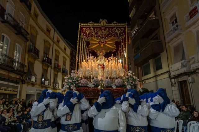 Al caer la noche de este Viernes de Dolores, festividad de la Patrona de Cartagena, la procesión del Santísimo Cristo de la Misericordia y María Santísima del Rosario, la más joven de la Cofradía California, se abrió paso en su recorrido habitual por el centro de la ciudad para cerrar la primera jornada de Semana Santa.