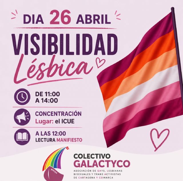 El colectivo GALACTYCO de personas Lesbianas, Gais, Transexuales, Bisexuales, Intersexuales y Asexuales de Cartagena y Comarca ha organizado para este domingo, 26 de abril, a las 12:00 horas la lectura de un manifiesto con motivo del Día de la Visibilidad Lésbica en la Plaza del Icue de Cartagena.