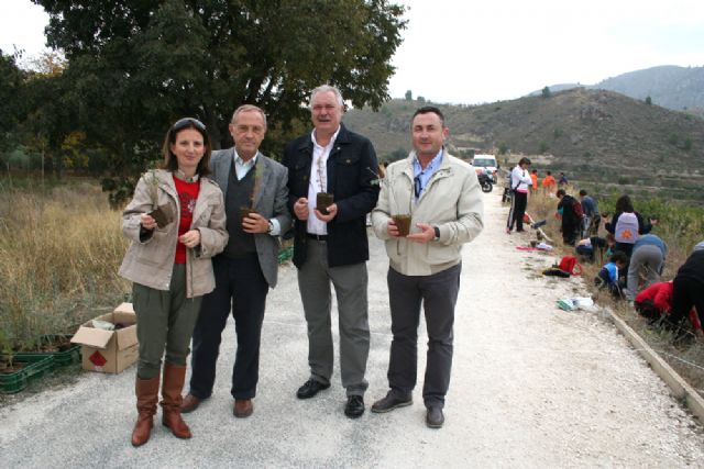 El alcalde de Cehegín, José Soria, la concejal de Medio Ambiente, María Dolores Carrasco, el responsable del Área de Medio Ambiente de la Fundación Cajamar, Alfonso Sevilla, y el gerente del Consorcio Turístico de la Vía Verde, Juan Soria, han encabezado la última actividad del proyecto de reforestación con especies autóctonas 'Verde, que te quiero, Vía Verde', que han llevado a cabo los niños de 4° de Primaria de los colegios de la localidad.