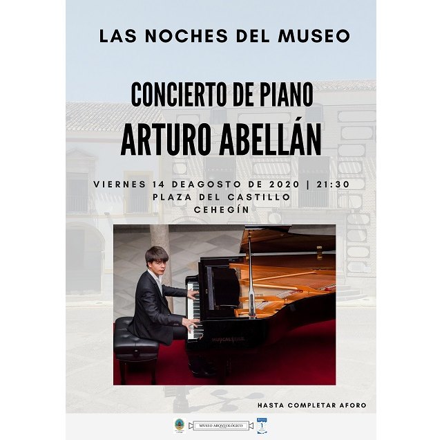 El joven y virtuoso pianista, Arturo Abellán Sánchez, ofrecerá este próximo viernes, 14 de agosto, un concierto de piano en la Plaza del Castillo de Cehegín, dentro de las “Noches del Museo”, actividades que se vienen desarrollando a lo largo de este mes de agosto. Están organizadas desde la concejalía de Cultura, que dirige Juan Martínez. Será a las 21:30 horas hasta completar aforo.