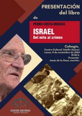 El lunes 11 de noviembre a las 19:30 horas, el Centro Cultural Adolfo Suárez de Cehegín será el escenario de la presentación de "Israel. Del mito al crimen", la nueva obra de Pedro Costa Morata, reconocido ingeniero, sociólogo, periodista y Premio Nacional de Medio Ambiente. El evento será presentado por el escritor Jesús de la Ossa Abril.