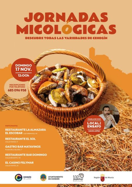 El concejal de Comercio y Hostelería, José Antonio Zafra, ha anunciado que la Asociación de Comerciantes y Hosteleros de Cehegín organiza unas Jornadas Micológicas los fines de semana del 16-17 y 23-24 de noviembre.