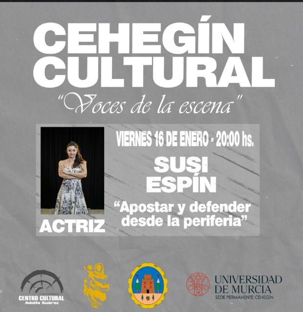 El ciclo comenzará este viernes 16 de enero con una conferencia muy especial a cargo de la gran actriz ceheginera Susi Espín, quien abrirá la programación con la ponencia “Apostar y defender desde la periferia”. Una cita destacada que pone en valor el talento local y la trayectoria profesional de una intérprete nacida en Cehegín, convertida en referente del teatro regional.