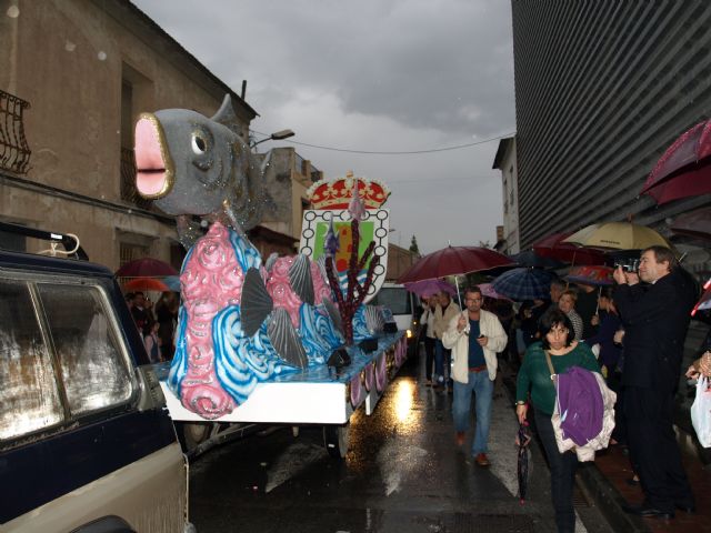 La sardina que se quemará en Murcia como conclusión de las Fiestas de Primavera de la capital tuvo un desahogo en Ceutí antes de su sacrificio, dándose ayer un baño de lluvia y de las multitudes, con paraguas, que no dudaron en recibirla y festejarla a pesar del mal tiempo.