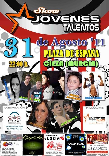El colectivo Jóvenes Talentos Región de Murcia, actuarán el último día de las fiestas de Cieza (31 de Agosto), en la que actúan artistas de la talla de Buena Onda (Representantes españoles en los premios estrella música award de Miami), Danny Ulma (Uno de sus temas se incluye en el disco estrella de este año “feel”), Sergio Almagro (Concursante del programa televisivo “Quiero cantar” de Antena 3), Cristina Trujillo (Ganadora en canción femenina en los 7 Magnificos), Lorena Lucas (Ganadora de diversos premios veo, veo), Just Dance (Ganadores en Baile del programa nacional Jòvenes Talentos) y Manu & Abel (Finalistas de CiezaTalentos).