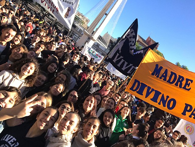 Bajo el lema Christus vivit, el municipio de Cieza acogía esta mañana el XII Encuentro de alumnos de Religión Católica, organizado por la Delegación de Enseñanza, al que han acudido más de 2.000 alumnos de 4º de la ESO y 1º de Bachillerato, procedentes de 40 centros formativos de toda la Región de Murcia. "Ha sido un día de convivencia estupendo en el que los jóvenes han podido ver que ni son tan pocos los que cursan Religión ni están locos, sino que son gente divertida con mucho que celebrar por conocer a Dios", aseguraba José Luis Méndez, coordinador de Educación Secundaria en la Delegación de Enseñanza.