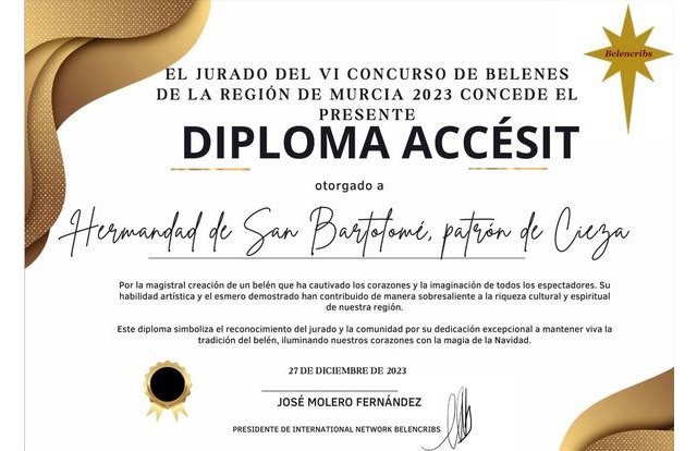 «Por la magistral creación de un belén que ha cautivado los corazones y la imaginación de todos los espectadores. Su habilidad artística y el esmero demostrado han contribuido de manera sobresaliente a la riqueza cultural y espiritual de nuestra Región". Así puede leerse en el diploma otorgado a la hermandad que preside Cristóbal Herrera y que simboliza el reconocimiento del jurado y la comunidad por "su dedicación excepcional a mantener viva la tradición del belén, iluminando nuestros corazones con la magia de la Navidad".