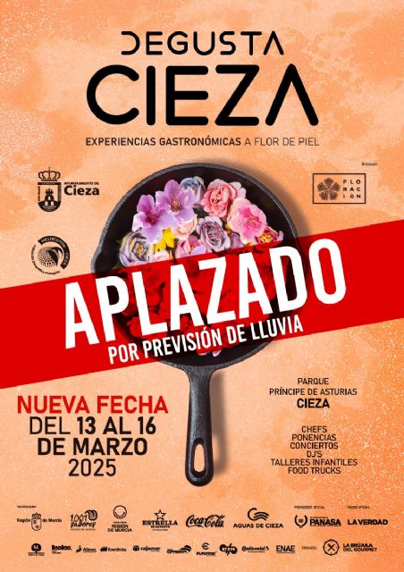 Fuentes de la Concejalía de Comercio y Hostelería del Ayuntamiento de Cieza han confirmado el aplazamiento de la feria gastronómica Degusta Cieza 2025, prevista su celebración del 6 al 9 de marzo, por el pronóstico meteorológico que anuncia lluvias generalizadas durante toda la semana.