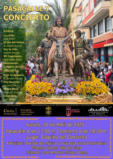 Un pasacalle musical de ritmo muy vivo y un concierto de marchas procesionales es lo que el Conservatorio de Música Maestro Gómez Villa tiene preparado este jueves, a las 17.00 horas y 18.00 horas respectivamente, para dar la bienvenida a la Semana Santa de Cieza, fiesta declarada de interés turístico internacional.