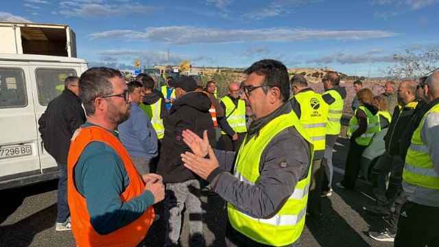 El alcalde de Cieza, Tomás Rubio, y el concejal de Agricultura, Manuel Martínez, se han desplazado esta mañana a la autovía A-30 para mostrar su apoyo al sector agrario en sus reivindicaciones contra el recorte de la PAC, un Mercosur que perjudique a los agricultores de la Región de Murcia, el cierre de los acuíferos en 2027 y los recortes al Trasvase Tajo-Segura.