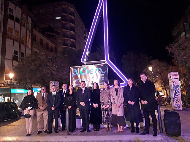 El alcalde de Cieza, Tomás Rubio, y el presidente de la Junta de Hermandades Pasionarias (JHP), Joaquín Gómez, asistieron este sábado junto a la consejera de Agua, Agricultura, Ganadería y Pesca, Sara Rubira, y la diputada nacional Miriam Guardiola a la inauguración del célebre icono que simboliza la Semana Santa de Cieza, declarada de Interés Turístico Internacional, cuya instalación ya luce en todo su esplendor.