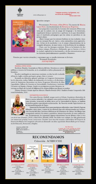 Los pequeños conocerán la historia del ratoncito Pérez contada por la autora con su juego del lenguaje y la literatura, empleando formas narrativas y poéticas en la que descubriremos el trasfondo pedagógico que los niños no perciben en un primer plano.