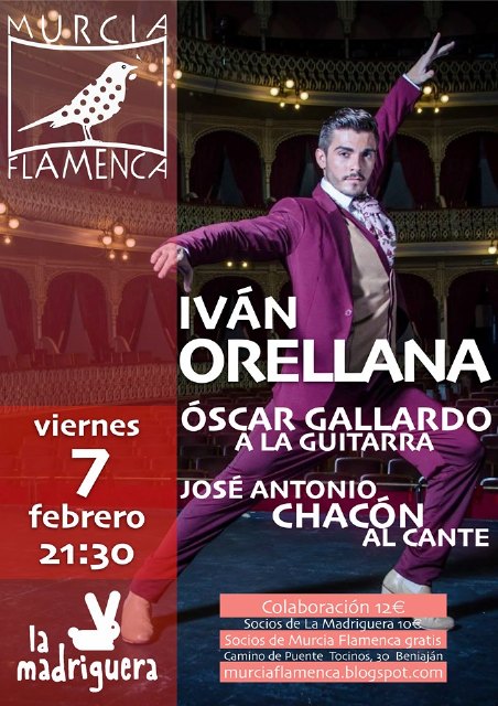 Iván Orellana actuará con Óscar Gallardo a la guitarra y el cante de José Antonio Chacón el viernes 7 de febrero a las 21.30 horas. Colaboración: 12 €, socios de La Madriguera 10 €, socios de Murcia Flamenca gratis.