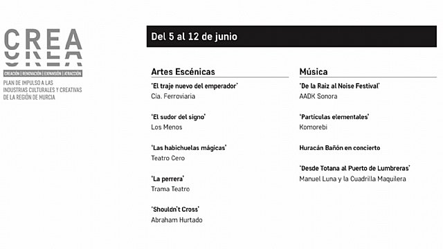 En el apartado musical, la oferta cultural se completa con ‘De la raíz al noise Festival’ de AADK Sonora; ‘Partículas elementales’ de Komorebi; Huracán Bañón en concierto; y ‘Desde Totana a Puerto de Lumbreras’ de Manuel Luna y la Cuadrilla Maquilera. Para disfrutar de estos contenidos culturales que estarán disponibles durante las 24 horas en los próximos días, sólo hay que acceder en el apartado ‘Plataforma CREA’ de la web del Instituto de las Industrias Culturales y las Artes.