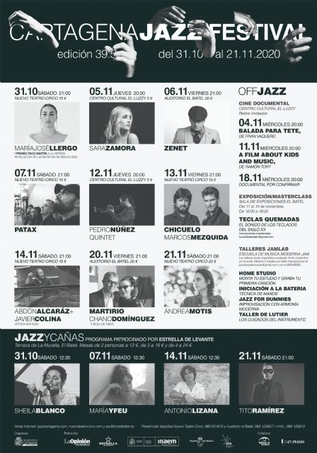 Cartagena seguirá sonando a jazz en noviembre, aunque este año, lo hará sobre todo a jazz flamenco. Vuelve el Cartagena Jazz Festival, con una edición especial en tiempo de pandemia, la 39.5, protagonizada por María José Llergo, Zenet, Patax, Chicuelo con Marco Mezquida, Abdón Alcaraz junto a Javier Colina, Martirio y Chano Dominguez cantándole 'A Bola de Nieve' y Andrea Motis. El festival organizado por el Ayuntamiento de Cartagena suma este año la programación 'Jazz y Cañas' con los conciertos de Sheila Blanco, María Yfeu, Antonio Lizana y Tito Ramírez. Las entradas y toda la información disponibles ensu web.