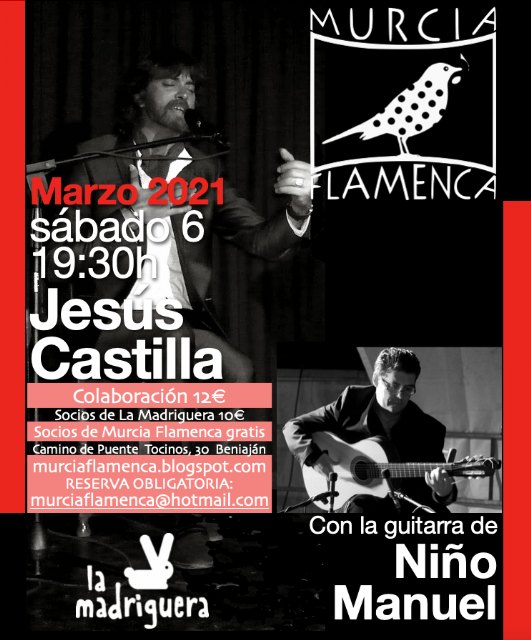 Disfrutaremos del cante de Jesús Castilla y la guitarra de Niño Manuel, el sábado 6 de marzo en La Madriguera a las 19.30 horas. Camino de Puente Tocinos 30, Murcia. Colaboración 12€. Socios de La Madriguera 10€. Socios de Murcia flamenca gratis.
