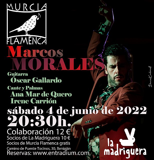 Marcos Morales actuará para Murcia Flamenca con la guitarra de Óscar Gallardo y el Cante y Palmas de Ana Mar de Quero e Irene Carrión, el sábado 4 de junio a las 20:30 horas en La Madriguera, Camino de Puente Tocinos 30, Beniaján. Colaboración 12€, socios de La Madriguera 10€, socios de Murcia Flamenca gratis.