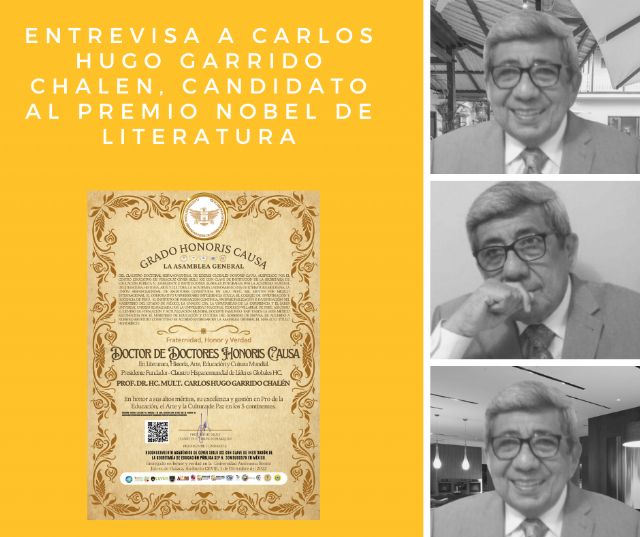 He tenido el placer de poder contactar y solicitar una entrevista al Dr. Carlos Hugo Garrido, Presidente de la Unión Hispanomundial de Escritores con presencia en 140 países; premio vivo de la humanidad, escritor de más de 45 libros y candidato a Premio Nobel de Literatura.
