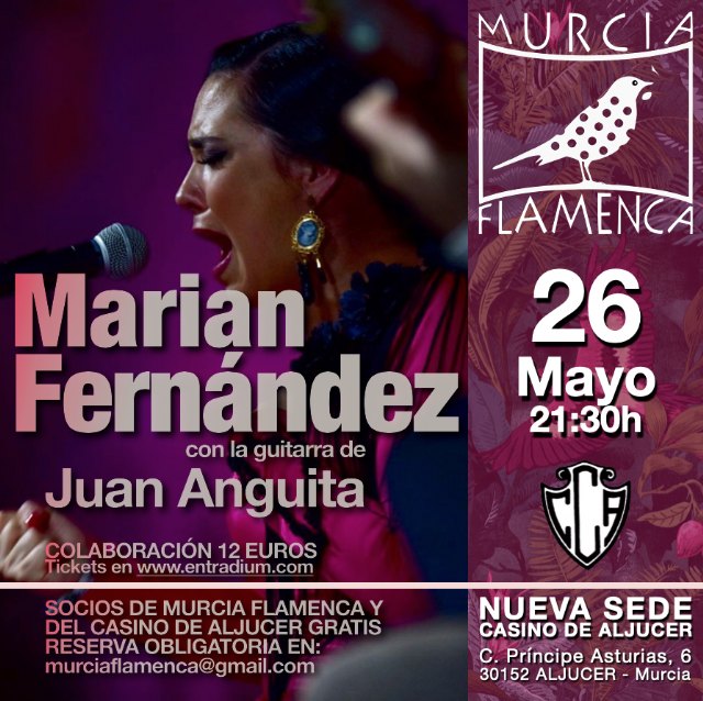 Disfrutaremos del cante de Marian Fernández con la guitarra de Juan Anguita el viernes 26 de mayo a las 21:30 horas en el Casino Cultural de Aljucer, C. Príncipe Asturias, 6. Aljucer, Murcia. Colaboración 12€. Socios de Murcia Flamenca y del Casino de Aljucer gratis.