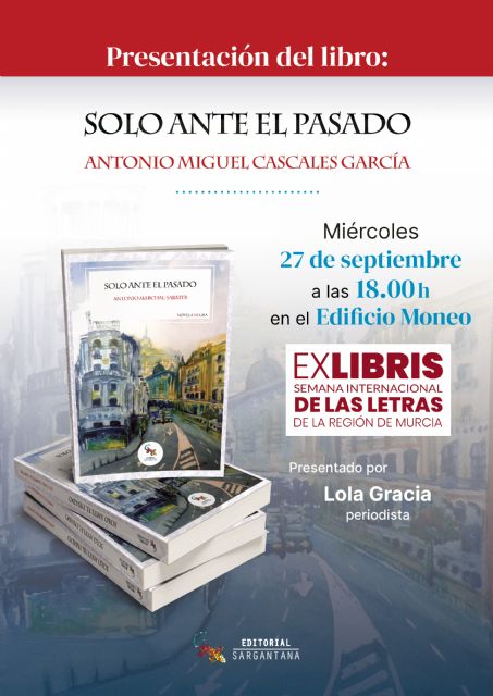 El autor Antonio Miguel Cascales presentará su última novela Sólo ante el pasado (Sargantana, 2022) el próximo 27 de septiembre en el salón de actos del Edificio Moneo (18.00), dentro de la Semana Internacional de las letras de la Región de Murcia, Ex Libris.