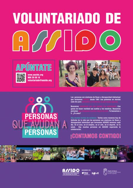La asociación para personas con síndrome de Down y discapacidad intelectual, ASSIDO, ha presentado este lunes en la Filmoteca Regional Francisco Rabal su campaña de promoción del voluntariado con el lema Personas que ayudan a Personas. Un trabajo que cuenta con dos spots publicitarios protagonizados por la actriz murciana y embajadora de la asociación, Pepa Aniorte, y por la voluntaria desde hace varios años, Elvira Ríos.