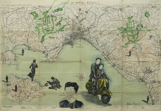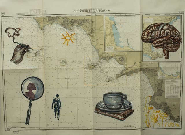Representar la superficie del planeta en el que vivimos de la manera más objetiva posible, parece ser la tarea de los mapas geográficos, el punto de llegada de un viaje que ha durado milenios. Que luego, la pretendida objetividad encuentre un límite en la curvatura de la tierra, tampoco es una novedad. La representación es convencional: montañas, lagunas, ríos, ciudades están todos en su lugar, todos marcados como esperamos, ninguno presente en sus formas particulares. El tiempo se ha detenido. Las fronteras entre un estado y los demás tienen un papel protagonista: cortan el mundo en muchas partes, con la pretensión de cercas infranqueables; incluso la guerra se representa en estas cartas y parece un juego casi inocente. Pues bien, las intervenciones pictóricas que interrumpen esta supuesta geometría quieren mostrar una espacialidad diferente, la de lo vivo y de lo vivido. Los dos artistas trabajan cada uno con su propio lenguaje. “La de Salvador Torres es una pintura sorprendente porque va más allá de toda certeza. Los cuerpos, que parecen vaciados como maniquíes sin alma, transmiten una espiritualidad que está en el límite entre una realidad perceptible en su iconografía y una verdad oculta de personajes que viven el drama de la existencia humana siempre en equilibrio entre el egoísmo y la necesidad de proponer un mundo mejor. Son obras atemporales: representaciones fantásticas surgidas de la imaginación; un mundo surrealista, no como un sueño que reelabora el propio inconsciente, sino como una visión subjetiva para una narración que escapa a la lógica estereotipada, presumida y habitual de un sistema social que ignora los peligros de su egocentrismo y arrogancia al descuidar las reglas fundamentales necesarias para mantener inalterado el equilibrio natural”. Lúcidamente escribe Mario Lanzione y luego, de nuevo, acerca de Enzo Trepiccione: “Si los sueños y los recuerdos son parte de nuestro subconsciente y de nuestra historia existencial, el de los símbolos es un sistema de comunicación que actúa sobre nuestros conocimientos. Un medio expresivo utilizado para llevarnos de vuelta al origen de contenidos que encierran una cantidad considerable de ideas y valores que ningún lenguaje humano podría aportar a la mente. Un solo símbolo esconde una miríada de significados. Estos son los elementos que encontramos en la pintura de Enzo Trepiccione, en un constante equilibrio entre la realidad y la imaginación. La espontánea operatividad pictórica de Enzo es precisamente esta simetría entre un pensamiento objetivamente existente y una propia subjetividad representada a través de representaciones de figuras estilizadas, reproducidas en “casilleros de la memoria”, de casas, árboles y flores, ejecutadas con una línea de contorno gruesa, fuerte, inmediata y rápida”.