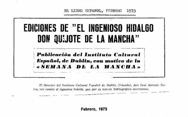 El Instituto Cultural Español de Dublín, en 1973, con motivo de la Semana de La Mancha, en colaboración con los centros provinciales de bibliotecas públicas, la Asociación irlandesa de Profesores de Español y los departamentos de Estudios Hispánicos de las universidades difundió el Boletin Estadístico Bibliográfico de las ediciones de El Ingenioso hidago Don Quijote de la Mancha y dió a conocer Cervantes en toda Irlanda.