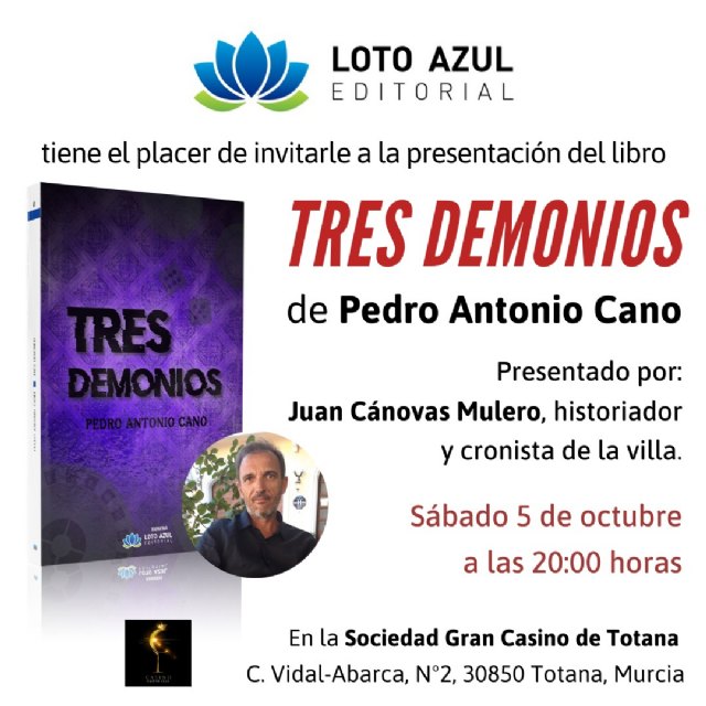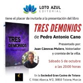 El próximo sábado 5 de octubre, a las 20 h., tendrá lagar en la Sociedad Gran Casino de Totana la presentación de Tres demonios, novela de Pedro Antonio Cano recientemente publicada.