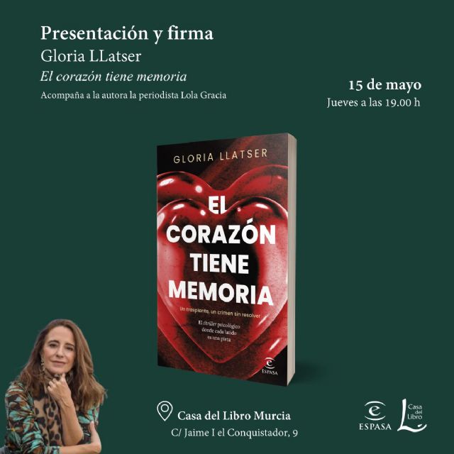 La escritora Gloria Llatser presentará su tercera novela El corazón tiene memoria (ESPASA, 2025) en Murcia el próximo 15 de mayo en La casa del libro de Murcia a las 19.00 horas.