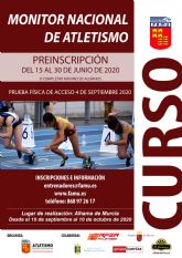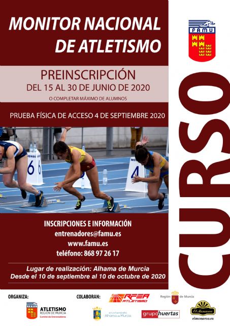 Ya se encuentra abierta la convocatoria para el curso de Monitor Nacional de Atletismo, organizado por la Federación de Atletismo de la Región de Murcia a través de su Comité de Entrenadores en colaboración con el Ayuntamiento de Alhama de Murcia y la Real Federación Española de Atletismo, con inicio previsto para el próximo 10 de septiembre.