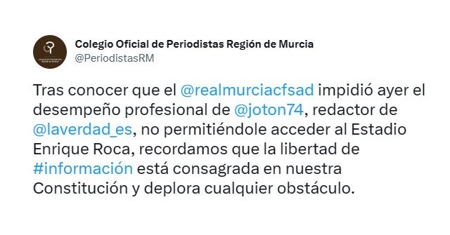 El Colegio de Periodistas ya emitió un comunicado a través de Twitter condenando el veto al periodista para acceder a la zona de prensa del Estadio Enrique Roca el pasado fin de semana, pero entendemos que, tras el veto, el posterior comunicado de la entidad grana agrava la situación, pues deja entender que dicha prohibición fue fruto de una decisión meditada, lo que pone los hechos en su verdadero contexto y supone un ataque frontal a la libertad de prensa.
