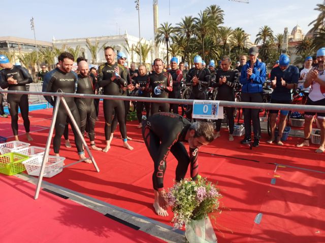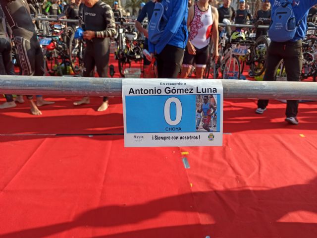 Cerca de 500 personas se han citado en el puerto de Cartagena, donde a las 9 horas de la mañana se daba la salida de la prueba absoluta. Previamente, la organización ha querido rendir homenaje a Antonio Gómez Luna, conocido como Choya, que falleció la semana pasada tras ser sufrir un atropello mientras entrenaba en bici. Desde la FTRM y el Club Triatlón Cartagena se ha puesto un dorsal 0 y se ha guardado un minuto de silencio en su memoria.