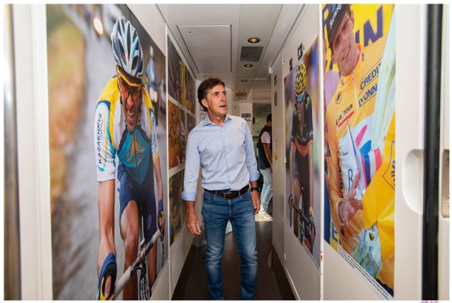 Perico Delgado visita la exhibición que rinde tributo a los 7 ciclistas españoles ganadores de la competición francesa y a los 11 corredores que lograron un segundo o tercer puesto