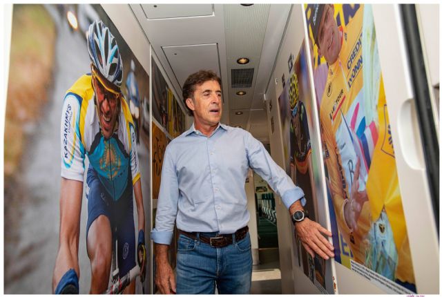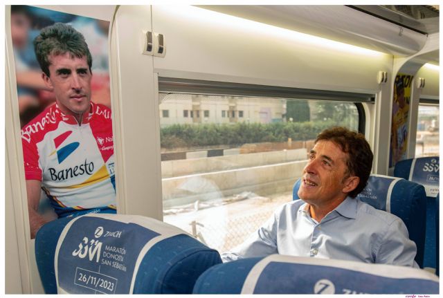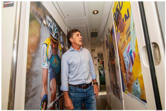 Entre los que estos días han sido espectadores de “Campeones eternos, sueños cumplidos” en el interior del tren Alvia con destino a Bilbao se encuentra uno de sus protagonistas. Pedro “Perico” Delgado ha sido testigo del tributo fotográfico de Renfe a los grandes del ciclismo. Ganador del Tour en 1988 y segundo en 1987.