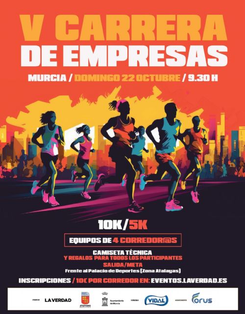 Este próximo mes de octubre, nuestra capital acogerá nuevamente otra cita distintiva, ofreciendo la oportunidad de que aquellos compañeros de trabajo que desarrollan multitud de horas de la mano a lo largo de su jornada laboral, compartan también un tiempo lúdico peleando por colocar a su empresa en lo más alto. Así será en el marco de la V Carrera de Empresas, a celebrar el domingo 22 a las 9:30h., con salida y meta en las inmediaciones del Palacio de los Deportes de Murcia (Avda. Miguel Induráin).