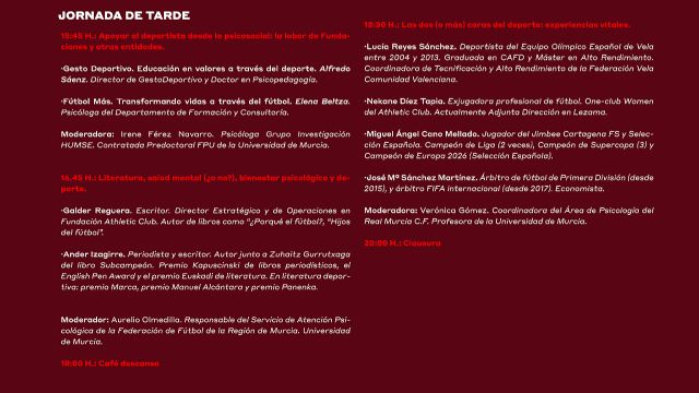A las 12:00 horas se desarrollará la mesa redonda “¿Qué pueden hacer los profesionales del deporte para promocionar la salud mental del deportista?”, con la participación de José Luis Acciari, exjugador profesional de fútbol y entrenador; Víctor Paredes Hernández, preparador físico en clubes como Rayo Vallecano y Real Madrid y profesor universitario; Manuel Arenas, nutricionista actualmente en la Selección Española de Fútbol Sala, campeón de Europa 2026; Mari Carmen Moles, psicóloga del deporte y la salud con amplia trayectoria en clubes y federaciones; y Raquel Urbano, fisioterapeuta de la Selección Española Absoluta Femenina de Fútbol.