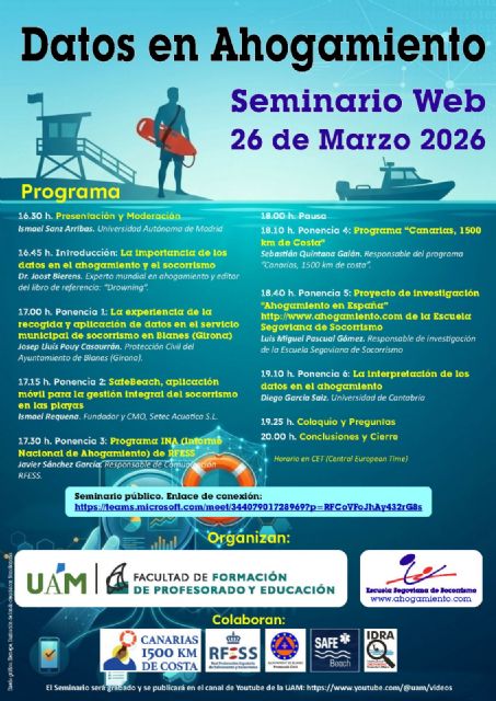 El seminario, que se desarrollará en formato online de 16:30 a 20:00 horas, está organizado conjuntamente por la Escuela Segoviana de Socorrismo, impulsora del proyecto de investigación 'Ahogamientos en España', y la Universidad Autónoma de Madrid (UAM), a través de su Facultad de Formación del Profesorado y Educación de la Universidad Autónoma de Madrid.