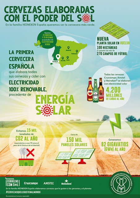 Gracias a esta nueva planta fotovoltaica, que cuenta con casi 150.000 paneles solares que generarán 82 GWh al año, las cuatro fábricas y todas las oficinas que HEINEKEN tiene en España funcionan exclusivamente con electricidad 100% renovable desde este mismo mes de octubre. Se evitarán así las emisiones a la atmósfera de 15 mil toneladas de CO2 al año, equivalentes a casi 70 veces el peso de la Estatua de la Libertad.
