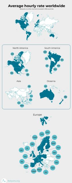 Para aquellos que vivan en otro país o, incluso, aquellos que se estén planteando contratar un canguro a distancia extranjero, Babysits ha proporcionado una infografía global en la que podrás comparar las tarifas medias entre más de 38 países.