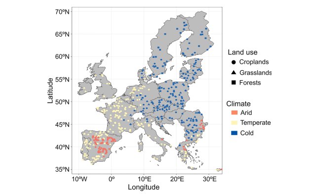 Mapa representativo de los diferentes suelos de Europa analizados según su ecosistema y clima en el artículo “Land-use- and climate-mediated variations in soil bacterial and fungal biomass across Europe and their driving factors” de Geoderma.