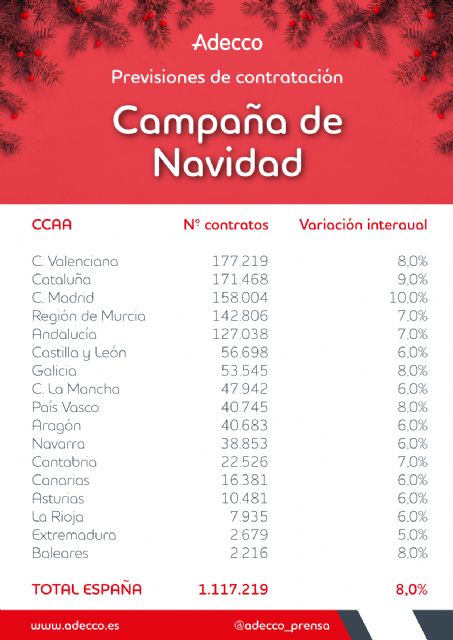 Ante esta situación, Adecco, líder mundial en la gestión de Recursos Humanos, prevé que durante los meses de noviembre y enero (ambos incluidos) se firmen en España cerca de 1.118.000 contratos, que suponen un 8% más que en el mismo periodo de 2020-2021 (el año pasado se firmaron 1.035.826 contratos).