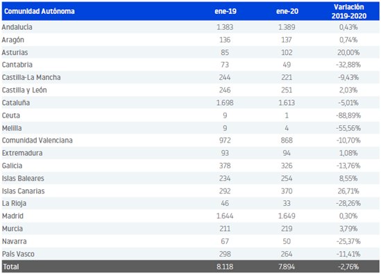 La comunidad que alcanza más constituciones en enero es Madrid, que llega a 1.649, el 21 % del total, seguida de Cataluña, con 1.613, y Andalucía con 1.389. Pero, mientras que Madrid y Andalucía mejoran sus datos ligeramente, un 0,3 y un 0,5 % respectivamente, Cataluña recorta un 5 %, el segundo descenso más abultado en valor absoluto tras las 104 que disminuye Valencia.